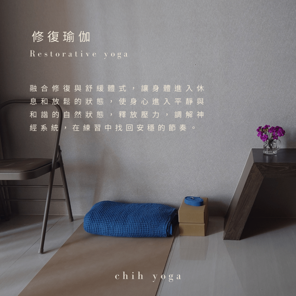 修復瑜伽( Restorative yoga )主要是讓身體進入休息和放鬆的狀態,更容易激活副交感神經系統,通過輕柔而有意識地讓身體在動與靜之間移動,使身心進入平靜與和諧的自然狀態。
