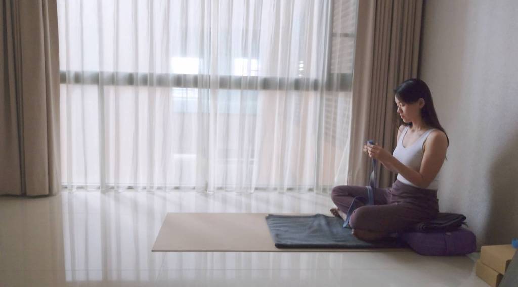 - 雙腿可以靠墻,也可以用瑜伽繩拉住或者直接向上伸展。