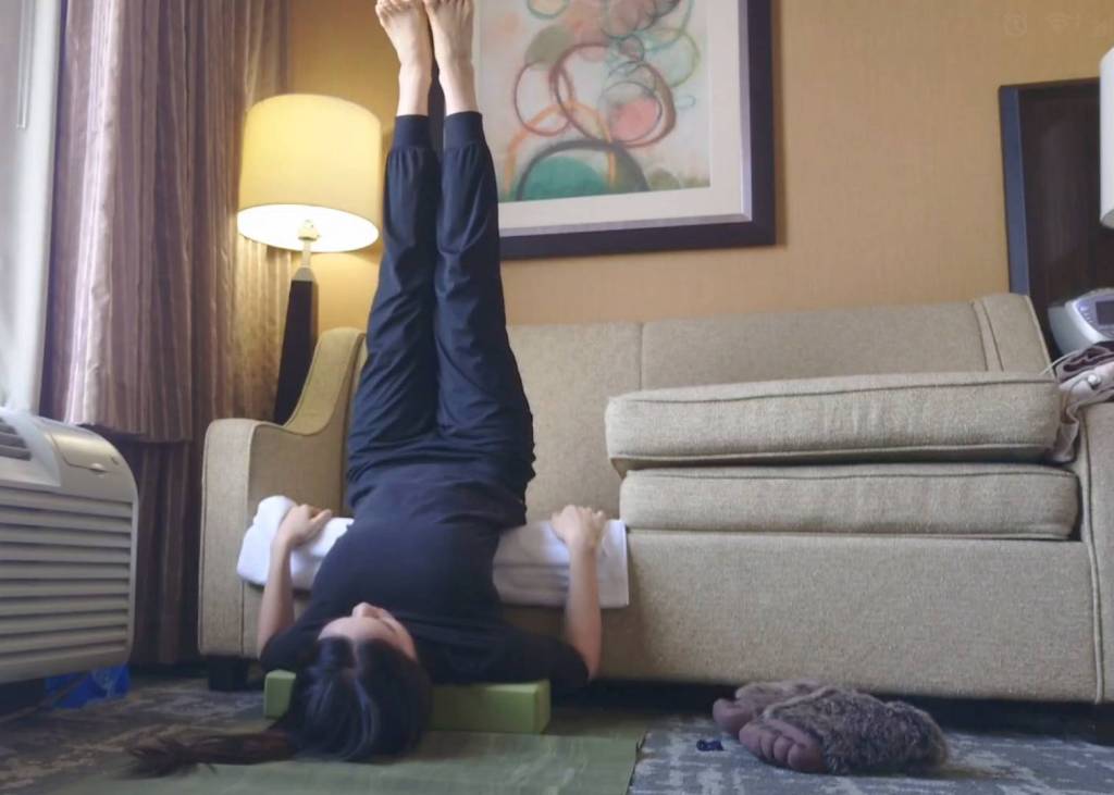 在沒有適合輔具的情形下,即使是外出,也可以在旅店房間練習。如果床太高的話,可以在肩部和頭後部墊上幾條毯子或者抱枕。除了增強消化系統和呼吸系統功能,也能幫助克服時差和旅途疲勞。